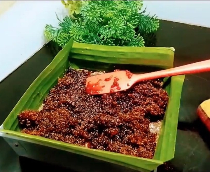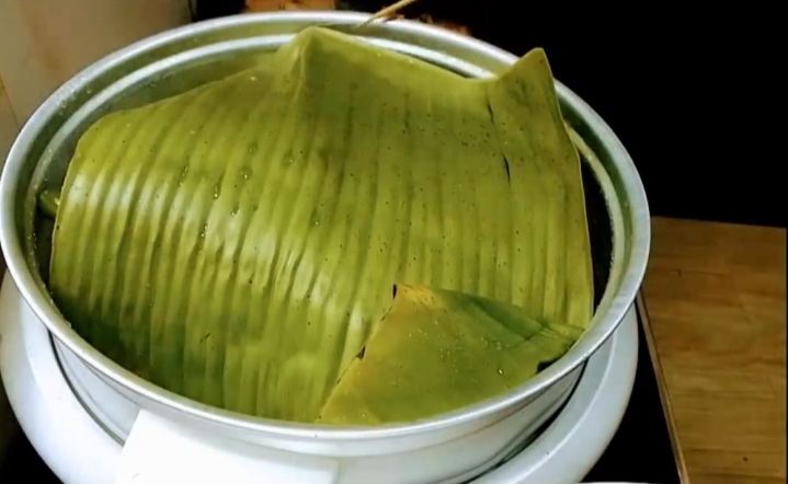 දැන් ඕක වැහෙන්න කෙසෙල් කොළ ඇතුලෙන් දාල එකේ තෙල් ගාගන්න.🤗කෙසෙල් කොළ නැති උන්ත් අවුලක් නෑ නිකම් තෙල් ටිකක් භාජනෙ ගාගන්න.